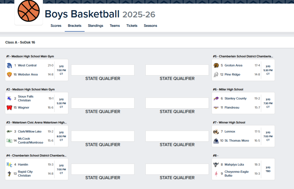 Congrats to the Boys Basketball team on qualifying for the SoDak 16 game on Tuesday, March 10 vs Rapid City Christian. The game will be in Chamberlain at 7pm.