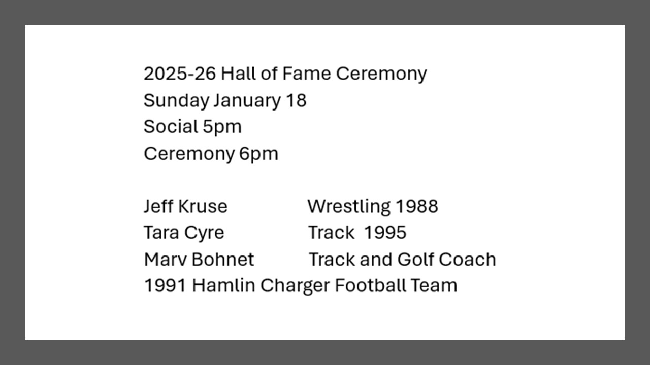 WELCOME TO HAMLIN SCHOOL DISTRICT! Our Mission To prepare and equip our students to become responsible citizens and succeed in an ever-changing world. Parent & Student Portal SchoolLunch Menu Diciembre Menu Spanish StudentActivities December Calendar Monthly Calendar-Spanish (diciembre) Our Chargers Reader's Theater - Superior at State Oral Interp Harper Nebel - Superior at State Oral Interp on her Serious Piece HHS - CTE HHS - CTE Welding Class Hamlin Education Center MS Charger Champion HS Charger Champion 4th Place Finish at State A Tourney Latest News Summer 2023 Library Hours May 25, 2023 May 2023 School Newspaper May 15, 2023 Here is the most recent plan for the CTE building (attachment plan H). May 10, 2023 « Previous 1 … 17 18 19 20 21 … 26 Next » Hamlin School will have a 10:00 start tomorrow (December 10). No Breakfast served or morning preschool. December 9, 2025 Teacher In-Service (1/19/26) December 9, 2025 Ala Carte Permission Form December 4, 2025 Youth Tobacco Survey December 2, 2025 Lift for Sale – see flyer for more info November 17, 2025 School Vehicle for Sale: November 11, 2025 1 2 3 … 13 Next » Non-Discrimination Statement Read More Mental Health Resources Read More Safe 2 Say South Dakota Read More Facebook Feed