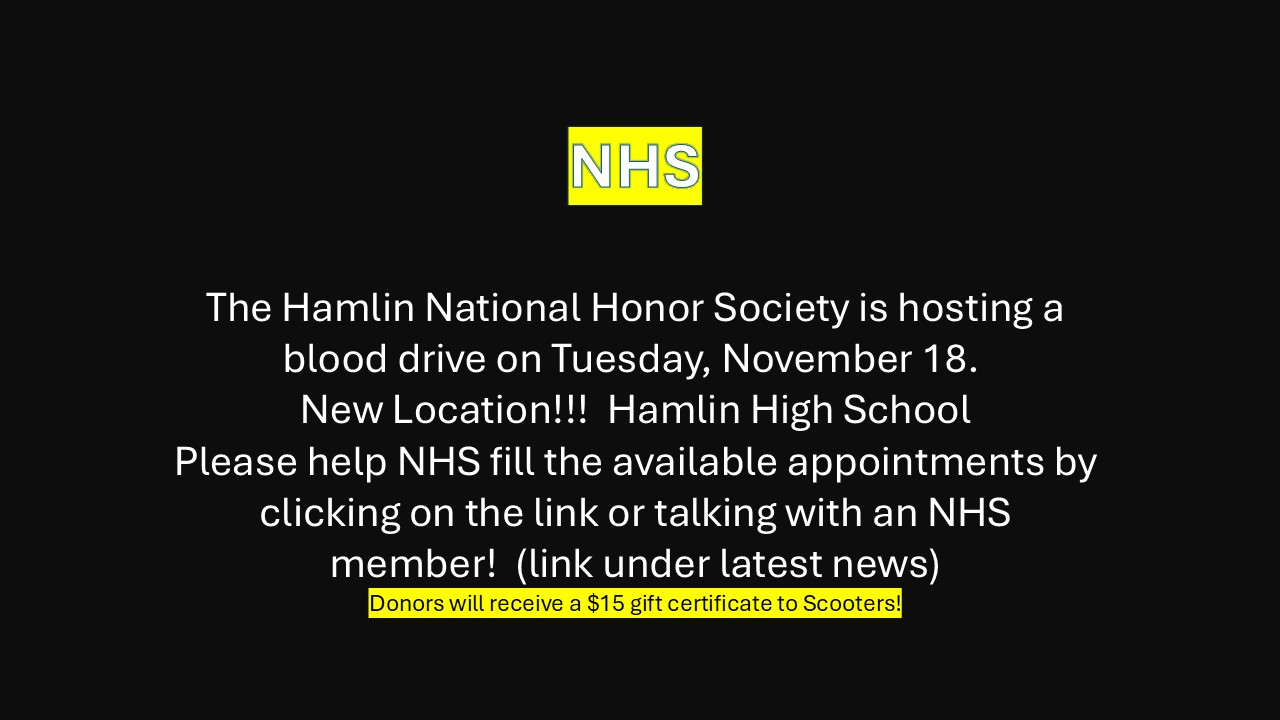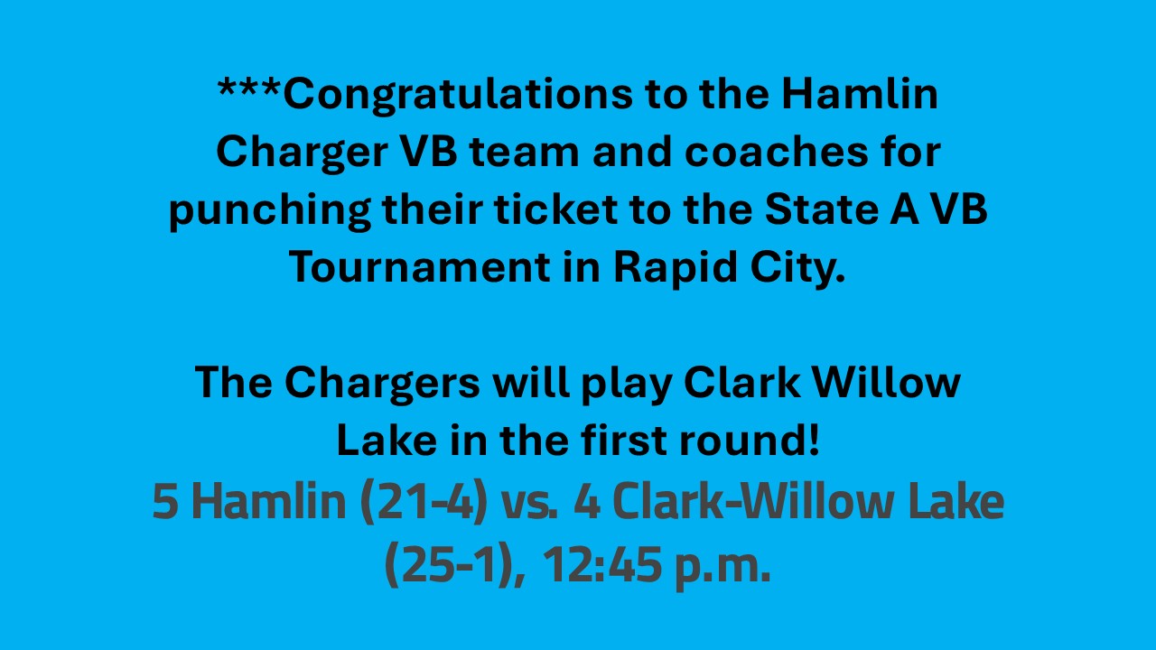 WELCOME TO HAMLIN SCHOOL DISTRICT! Our Mission To prepare and equip our students to become responsible citizens and succeed in an ever-changing world. Parent & Student Portal SchoolLunch Menu November Menu Spanish November Menu StudentActivities November Calendar Monthly Calendar-Spanish (noviembre) Our Chargers HHS - CTE HHS - CTE Welding Class Hamlin Education Center Amelia & Danica representing Hamlin at National FFA conference in Indianapolis MS Charger Champion HS Charger Champion Good Luck at State Volleyball! Latest News Congrats to Hamlin Girls Volleyball Team and Coaches on being state Bound. We play CWL 1st round at 12:45 on 11/20/25. November 12, 2025 School Vehicle for Sale: November 11, 2025 Book Club’s annual food drive will be held in early 2026 instead of this month. Please contact Mrs. Schultz if you have questions. November 11, 2025 « Previous 1 2 3 4 … 25 Next » NHS Blood Drive – Tuesday, Nov 18th November 14, 2025 Hamlin School will have NO SCHOOL on November 20 and 21st due to State Volleyball. Good Luck Chargers. We WILL have regular school on January 5, 2026. November 13, 2025 2025 State Volleyball Bracket and Ticket Information November 12, 2025 Congrats to Hamlin Girls Volleyball Team and Coaches on being state Bound. We play CWL 1st round at 12:45 on 11/20/25. November 12, 2025 School Vehicle for Sale: November 11, 2025 Book Club’s annual food drive will be held in early 2026 instead of this month. Please contact Mrs. Schultz if you have questions. November 11, 2025 1 2 3 … 13 Next » Non-Discrimination Statement Read More Mental Health Resources Read More Safe 2 Say South Dakota Read More Facebook Feed